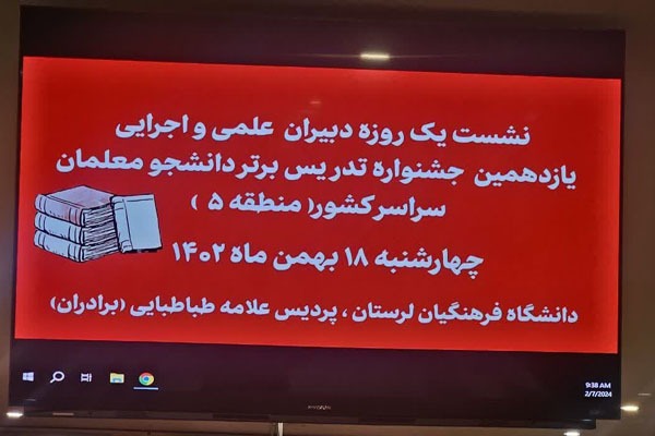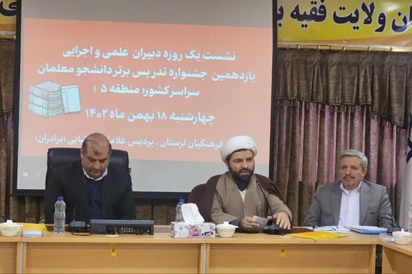 نشست دبیران علمی و اجرایی یازدهمین جشنواره «تدریس برتر» منطقه 5 کشور امروز، 18 بهمنماه با حضور کامران میرمعینی، دبیر کشوری یازدهمین جشنواره تدریس برتر، استانهای لرستان، خوزستان، ایلام، کرمانشاه و مرکزی به میزبانی دانشگاه فرهنگیان استان لرستان در پردیس علامه طباطبایی خرمآباد برگزار شد.