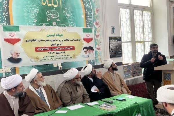 گردهمایی طلاب و روحانیون شهرستان الیگودرز در راستای همایش جهاد تبیین با موضوع راهکارهای جلب مشارکت حداکثری در انتخابات ۱۱ اسفندماه جمعه، ۲۷ بهمنماه به همت دفتر امام جمعه، اداره تبلیغات اسلامی و حوزههای علمیه با حضور طلاب و روحانیون این شهرستان برگزار شد.