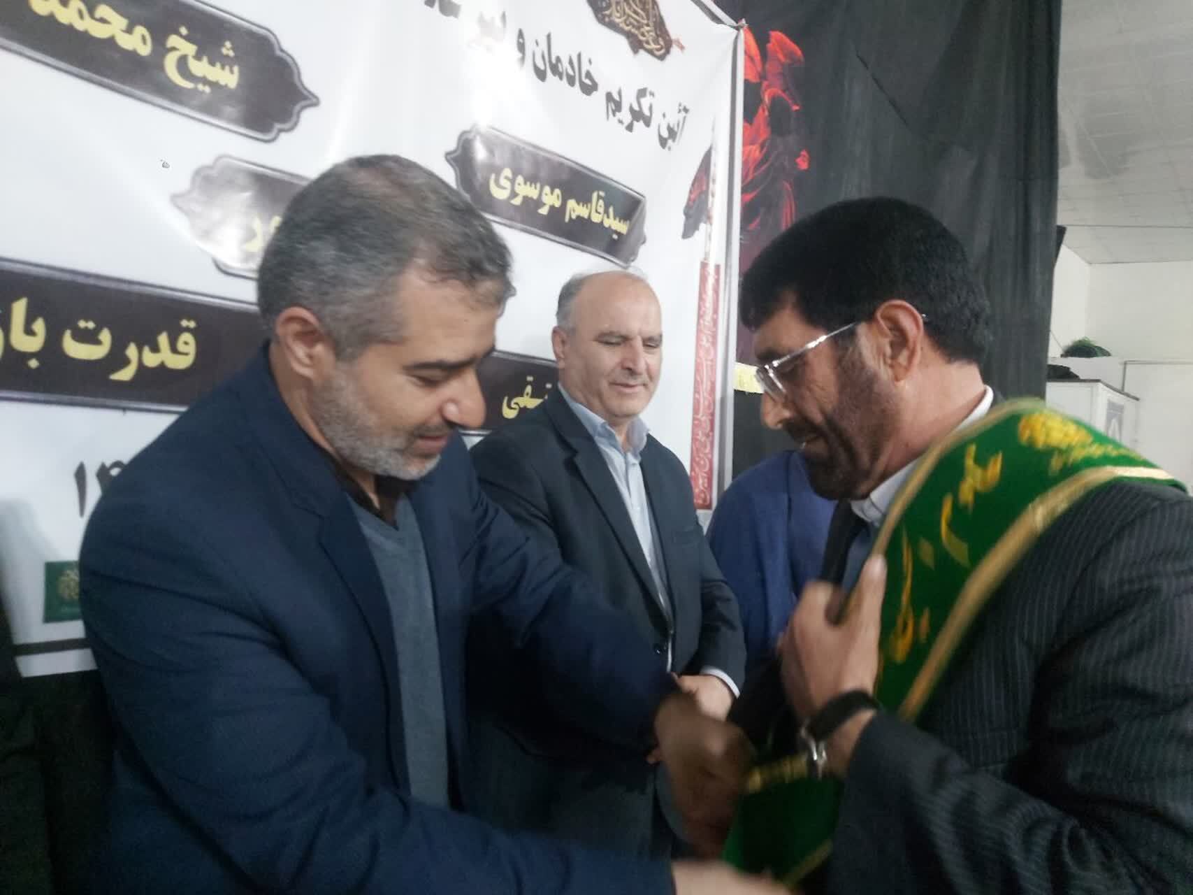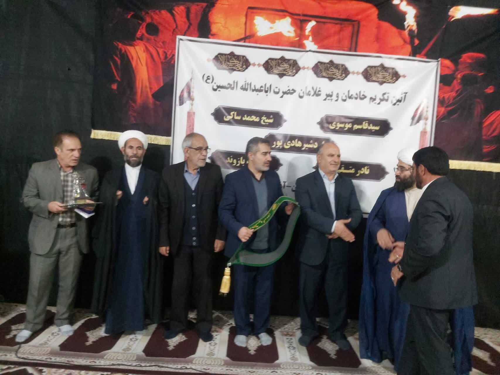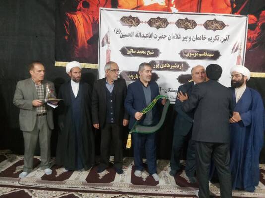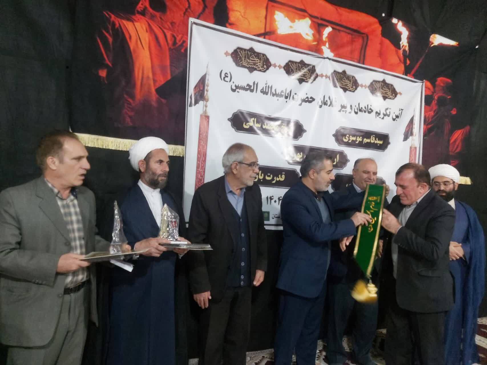 در این مراسم معنوی که در مسجد امیرالمؤمنین(ع) رومشکان برگزار شد، با اهدای لوح تقدیر مشترک از سوی حجتالاسلام محمدحسین وحیدی، مدیرکل تبلیغات اسلامی استان لرستان، حجتالاسلام محمد علینیا، امام جمعه شهرستان رومشکان تندیس ویژه پیرغلامان حسینی(ع)، حمایل خادمی حضرت اباعبدالله الحسین(ع) و هدایایی معنوی به پنج پیرغلام حسینی(ع) تقدیم شد و از سالها خدمت آنان در عرصه مداحی، نوحهخوانی و خادمی هیأتها قدردانی به عمل آمد.